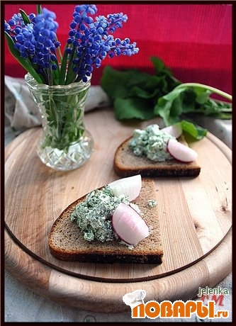 Выложить на теплый хлеб по 1ст.л. с горкой холодной укропной смеси, сверху поместить редис.