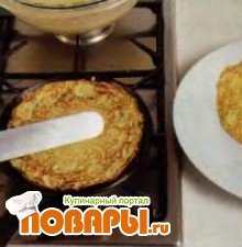 Поворачивайте сковородку, чтобы тесто равномерно распределилось по дну. Выпекайте блин приблизительно 10 секунд с одной стороны, а затем переверните лопаткой на другую.