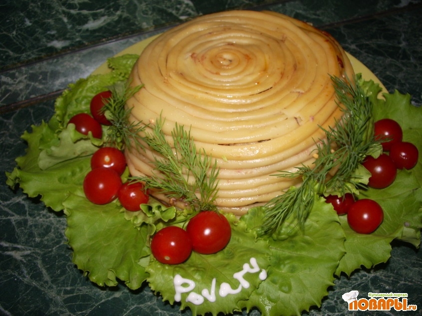 Кладем в форму начинку, приминаем ее, утопляем целые шампиньончики .Сверху делаем крышечку из макарон. Также спиралькой накручиваем наши макарончики :)