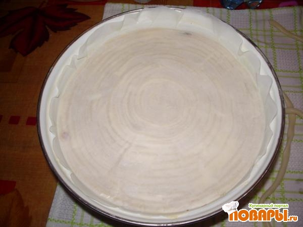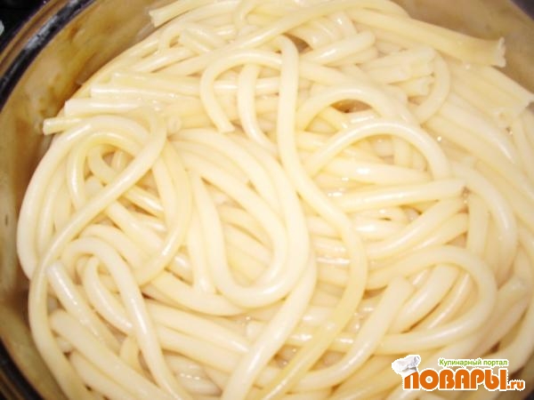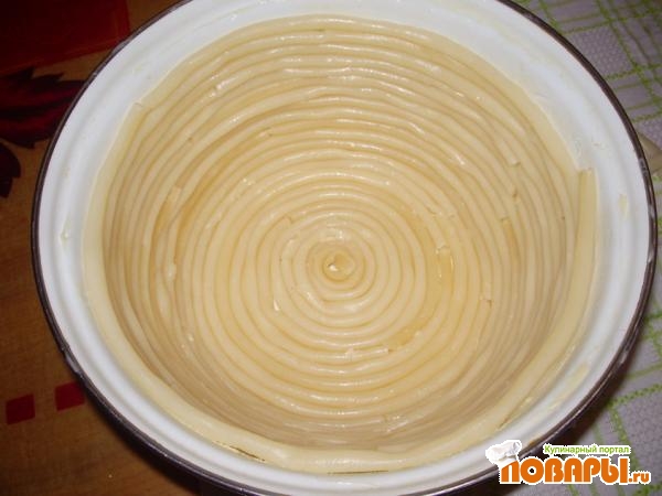 Форму обильно смазываем сливочным маслом. И с серединки начинаем на дно выкладывать макароны спиралькой.И так пока не выложим борта.