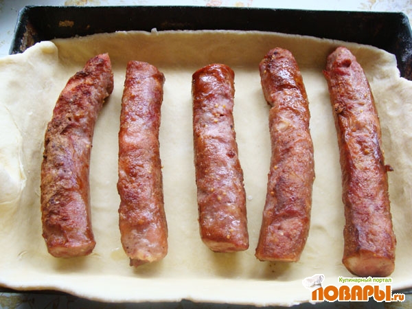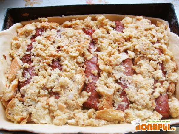 Из оставшегося 2/3 теста сформовать дно и бортики будущего пирога. Выложить колбаски и залить их приготовленной начинкой. Сверху установить крышечку от пирога, аккуратно слепить края верхнего круга и бортик.