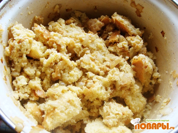 Обжарить их слегка со всех сторон на небольшом огне в 1 ст. растительного масла. Разломать батон и залить его молоком. Лук и чеснок мелко нарезать и потушить на оставшемся сливочном масле до прозрачного состояния. Размягченный батон раскрошить, добавить к ниму взбитые яйца, соль, перец и карри. Смешать с обжаренным луком и чесноком.