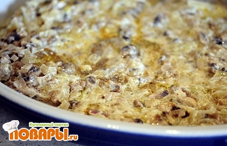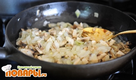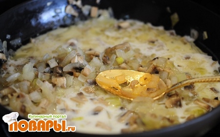 Лук порезать кубиками и добавить к грибам. Когда лук поджарится до не хрустящего вида, добавляем сметану, соль, черный перец- по вкусу. Все перемешиваем тушим минут 15.