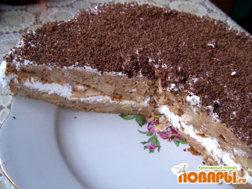 В конце добавляем мелко порезанные яблоки. Все хорошо перемешиваем, выливаем в форму, предварительно смазанную маслом и присыпанную мукой. Форма диаметром 28 см. Выпекаем при температуре 180 градусов, примерно 40 минут. Даем коржу остыть. В это время делаем крем, взбиваем сливки с сахарной пудрой и ванилью.Разрезаем корж на две части и смазываем взбитыми сливками. Присыпаем тертым шоколадом.