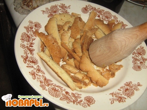 Может так статься, что коржи не удались и раскрошились, и бока не ровные, тогда в крошки можно подмешать панировочные сухари, смешать со сметаной, и просто зашпаклевать все огрехи.