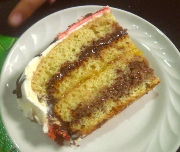 Готовый корж немного охладить в форме, вынуть вместе с бумагой, перевернуть, бумагу аккуратно снять. Дать остыть, разрезать на 3 - 4 части, с помощью кисточки слегка пропитать нижний корж, положить половину начинки толстым слоем немного не доходя до краев, накрыть другим коржом, пропитать, намазать джемом, накрыть третьим коржом, слегка пропитать, снова наложить начинку, накрыть последним коржом.