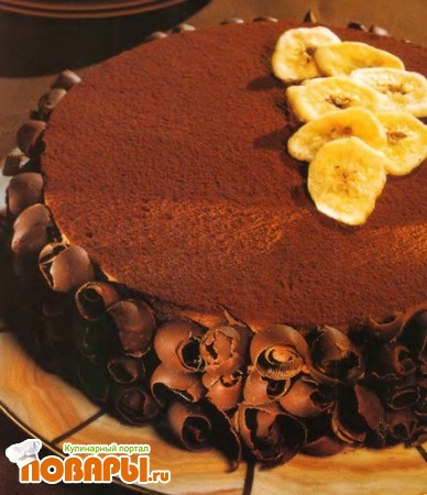 Посыпьте торт какао-порошком и приготовьте шоколадную стружку, поскоблив картофелечисткой края плитки шоколада. Приклейте шоколадную стружку к боковой стороне торта по всей окружности и при желании украсьте сверху тонкими ломтиками сушеных бананов.
