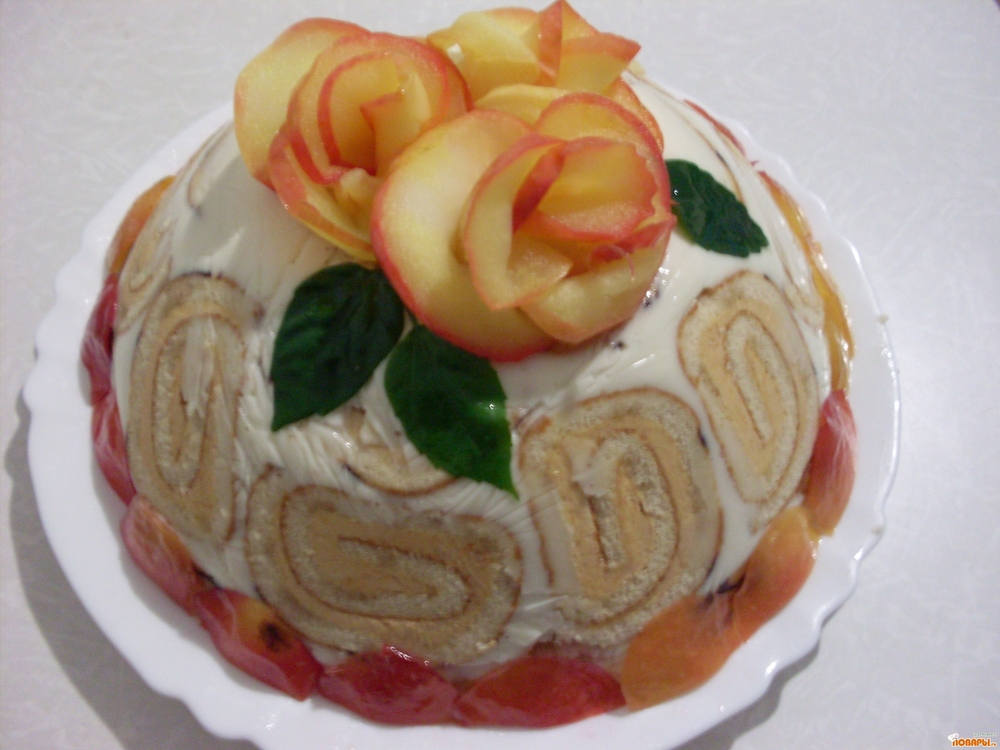 Готовый торт перевернуть на блюдо и снять целофан. Украсить розами из яблок - проварить тонкие ломтики яблока в сахарном сиропе ( 1 стакан воды = 1 стакан сахара)