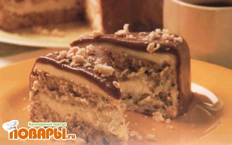 Для бисквита яичные желтки, отделив от белков, разотрите с сахаром добела, добавьте 10 столовых ложек холодной воды, муку, смешанную с разрыхлителем, измельченные орехи, замесите тесто. Яичные белки взбейте в пену, в несколько приемов соедините с тестом.