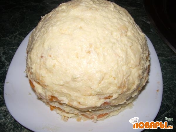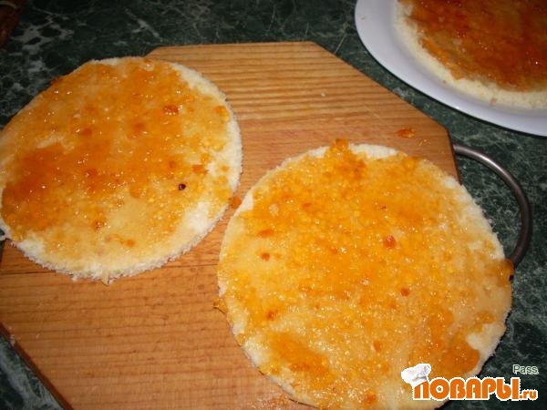 Каждый корж промазываем джемом, кремом и сверху каждого коржа кладем дольки абрикоса. Остатки коржей режем на кубики и смешиваем с остатком крема.