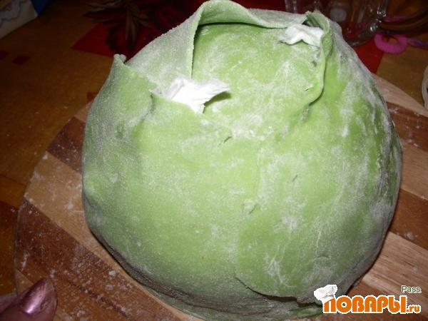 Добавляем пищевой зеленый краситель. Ну а дальше начинаем раскатывать мастику, вырезаем капустные листья и создаем кочанчик.