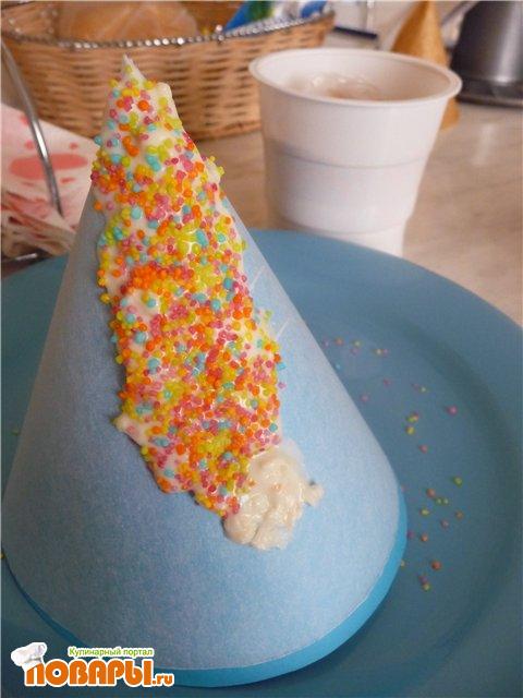 Колпак клоуна: Из картона делаем конус, поверх картона - пекарскую бумагу/