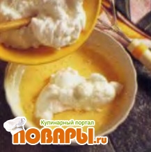 Взбейте белки со щепоткой соли в густую пену при помощи миксера (венчик должен быть тщательно вымыт). Добавьте в желтковую массу, аккуратно размешивая снизу вверх.