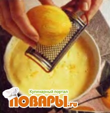 Включите духовку. Ркастопите сливочное масло на очень слабом огне и дайте ему остыть. Введите расплавленное масло в тесто и добавьте тертую цедру лимона, продолжая размешивать снизу вверх.