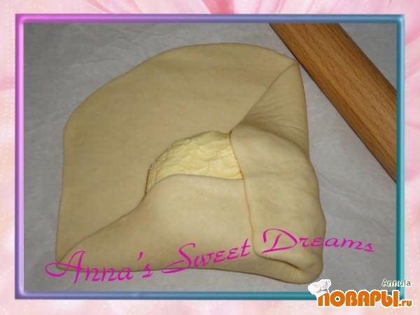 Через 20 минут опять раскатать, свернуть вчетверо, сложить, завернуть, убрать в холодильник. Повторить все эти процедуры еще 1 раз через 20 минут.
