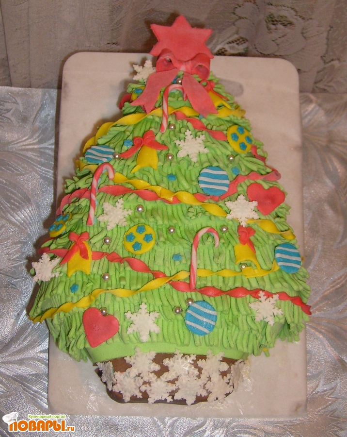 Собрать торт пропитывая коржи сладким сиропом и перемазывая их кремом. Обмазать весь торт кремом под мастику и поставить в холодильник застывать,можно не разравнивать крем--это придаст дополнительный объём нашей ёлочке. Покрыть торт полосками мастики с нарезанной бахромой-иголочками, украсить ёлочку по своему вкусу.