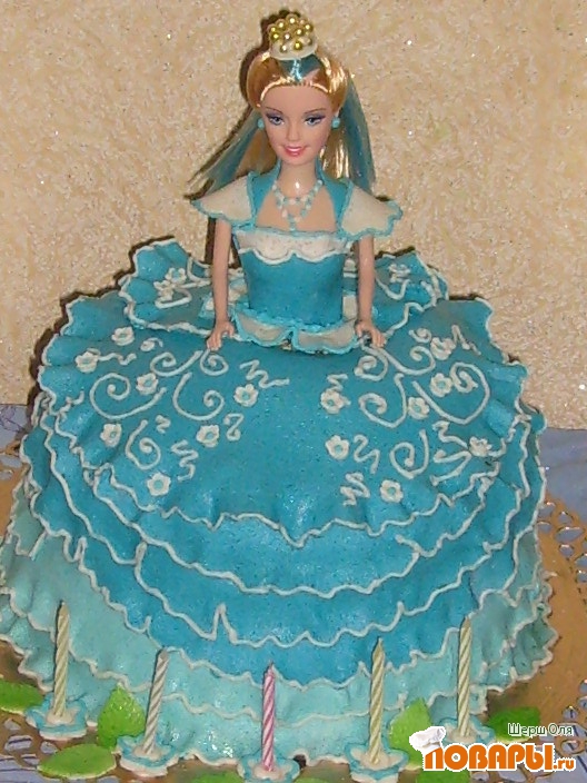 Приготовить сироп - в стакан кипятка положить сахар, размешать и остудить, далее собираем коржи, придавая форму юбки, каждый пропитываем немного сиропом и намазываем крем, через 2-3 слоя посыпаем орехами, и так до конца, украшаем по своему вкусу, у меня мастика, вставляем куклу без ножек, завёрнутую в фольгу до половины, и завершаем всю работу.