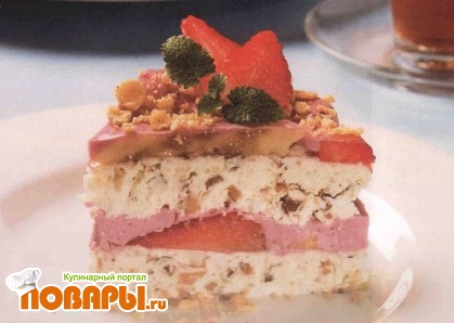 Бананы нарежьте ломтиками, крупные ягоды клубники разрежьте пополам, мяту обдайте кипятком. В разъемную форму уложите, чередуя, слоями творожную массу, фрукты и мяту, поливая йогуртом каждый слой фруктов. Выдержите торт в холодильнике до застудневания. При подаче выложите торт из формы, нарежьте на порции.