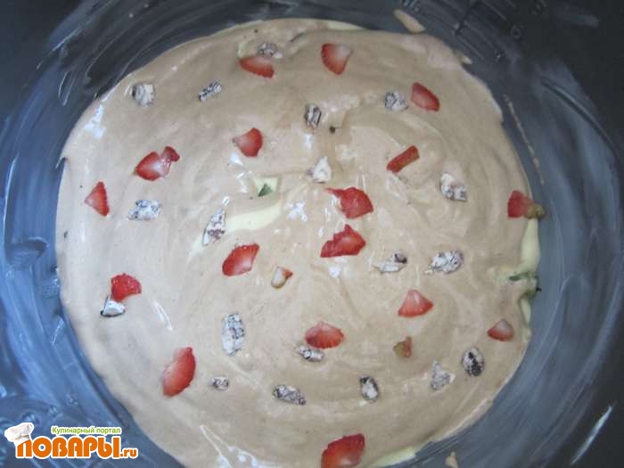 Разделяем полученную массу на две части и в одну добавляем ст. ложку какао порошка. Получается тесто двух видов. Дальше берем и смазываем форму мультиварки сливочным маслом и заливаем немного теста. На тесто выкладываем мелко нарезанную клубнику и кусочки зефира.