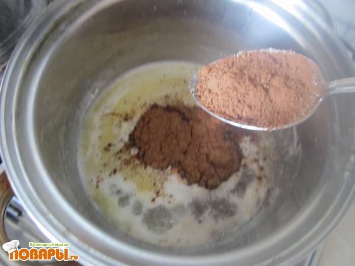 Тем временем готовим шоколадную глазурь. Смешиваем воду, сахар и 50 грамм сливочного масла, добавляем какао порошок и варим все это пока консистенция не станет однородной и не начнет становится густой.
