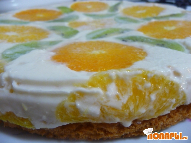 Киви и апельсины очищаем, нарезаем тонкими кружочками и полукружочками. Выкладываем ими форму - дно и бока.