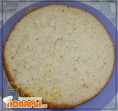 Бисквит остудить, разрезать на 2 коржа.