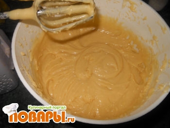 Приготовить заварной крем: Желтки взбить с сахаром, добавить к ним муку, все хорошо перемешать. Молоко довести до кипения, но не кипятить и понемногу влить к мучной массе, хорошо перемешивая все. Перелить крем в кастрюльку и варить помешивая до загустения крема.