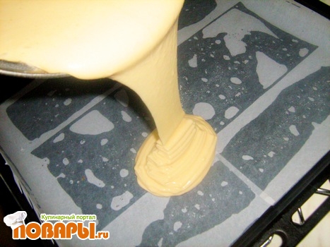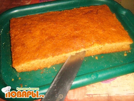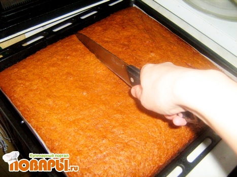 Так как тесто бисквитное, то противень обязательно нужно выстлать пергаментной бумагой смазанной жиром. У меня пергамента не было, я использовала обыкновенную бумагу для принтера, просто хорошенько пропитала ее растительным маслом - получилось отлично!