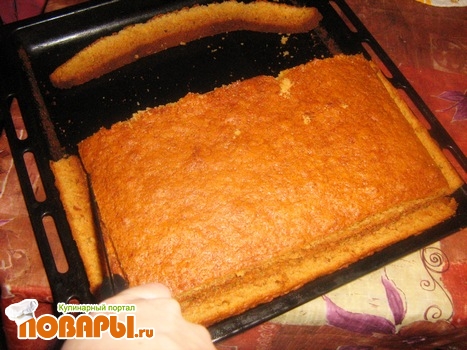 Аккуратно отлепляем корж от бумаги, кладем его сверху на вторую часть. Обрезаем по краям, что бы коржи получились ровными