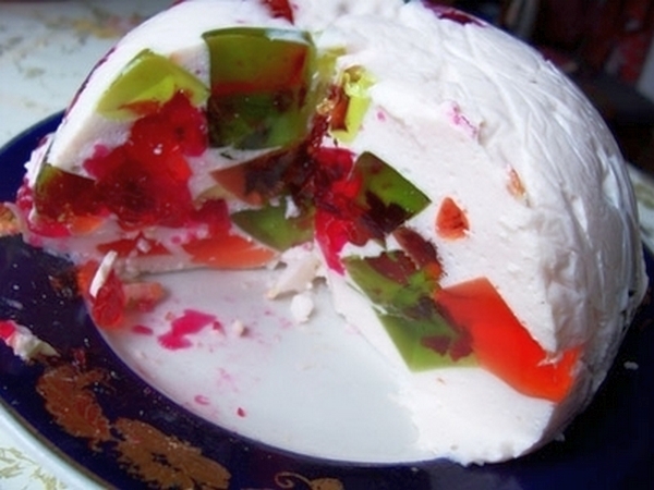 В первую очередь надо приготовить фруктовое желе разных цветов. Я обычно готовлю пачку желе на стакан воды. Заливаем в мелкую форму. Даем застыть и режем на кубики. Творог с йогуртом бросаем в блендер и все взбиваем до однородной массы. Желатин растворяем в 12 стакане воды и вливаем в творожно-йогуртовую массу. Еще разок взбиваем на блендере.
