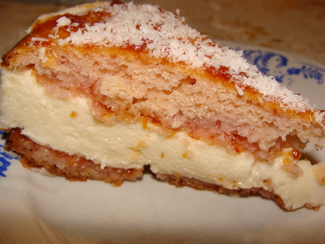 Коржи надо смочить холодным сладким чаем, смазать вареньем. Потом уложить корж на дно тортовницы, сверху крем и опять корж. Смазать сверху опять тонким слоем варенья и присыпать кокосом. Тортик поставить в холодильник на пару часов, для застывания.