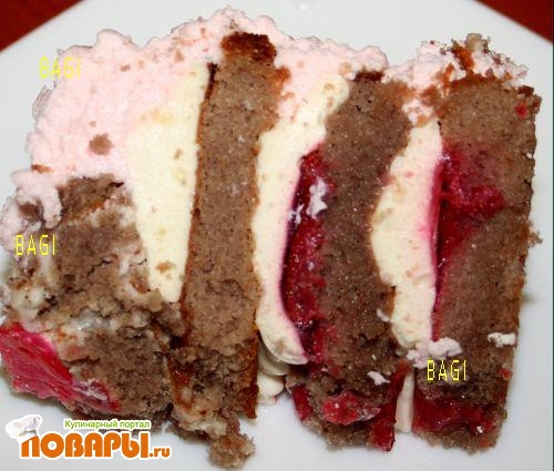 Вначале хорошо взбить яйца с сахаром, потом добавляем остальное и хорошо взбиваем. Испечь три коржа. Форма диаметр 20 см. В коржах стаканом вырезать дырочки. На коржи выложить клубнику и залить желе