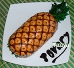 Из обрезков бисквита формируем небольшой хвостик, обмазываем его масляным кремом, даём застыть крему в холодильнике и обтягиваем зелёной мастикой. Заранее сделать из мастики листочки для хвостика. Приставляем наш хвостик к ананасу, приклеиваем с помощью сахарной пудры листочки. Подкрашиваем листья немного коричневой краской.