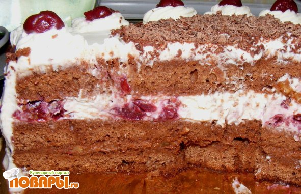 Остудить готовый бисквит, разрезать на три части. Нижний корж пропитать сиропом вишни с сахаром, можно добавить ложку коньяка. Выложить шоколадный крем, посыпать орехами. На следующий корж, также хорошо пропитанный сиропом, выкладываем густой сметано-творожный крем, выкладываем вишню. Накрываем верхним, третьим коржом, пропитываем и украшаем взбитыми сливками, вишней и тертым шоколадом.