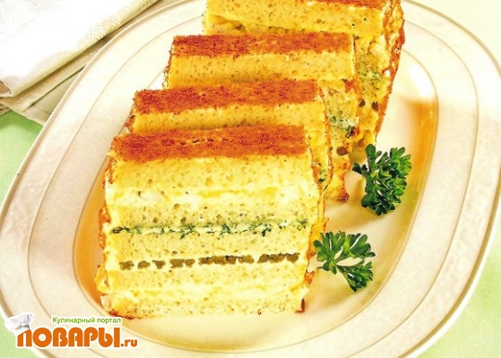 Чередуйте слои хлеба, сырной массы и куриной начинки. На второй пласт уложите спаржу (2).