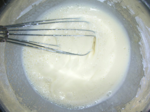 Яйца взбить с сахаром, добавить муку и молоко, все хорошо смешать, чтобы не было комочков.