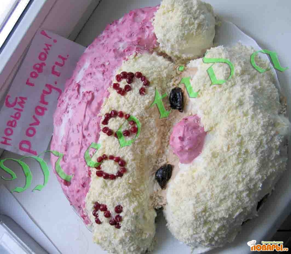 делаем глазки из чернослива. посыпаем тертым белым шоколадом кисточку, бороду и каемочку на шапочке. выкладываем клюковкой год и..