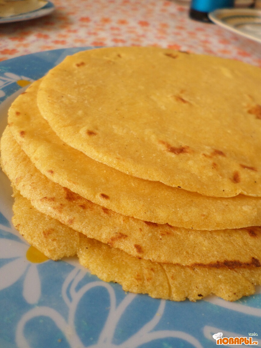 От этого тортилья начнет надуваться, когда надуется, или пойдет пузырями, тортилья готова. Готовые тортильи складывать на тарелку и всегда укрывать их чистой хб. салфеткой. Желательно употреблять горяченькими, но если остынут, то можно слегка подогреть в духовке или на сухой сковородке.Честно говоря мексиканцы готовят из другой муки, другим способом, этот вариант мне подсказала одна никарагуанка. Она только так делает и тортильяс получаются очень вкусные.