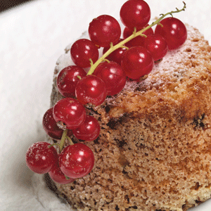 Сразу перевернуть на тарелку, посыпать сахарной пудрой и декорировать веточкой свежей красной смородины.