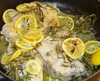 В огнеупорную форму выложить несколько веточек розмарина, сверху положить рыбу, посыпать каперсами и оставшимся свежим розмарином. Запекать рыбу в разогретой до 200ºС духовке около 25 мин., уложив сверху на рыбу после 5 мин. запекания тонко нарезанный ломтиками лимон.