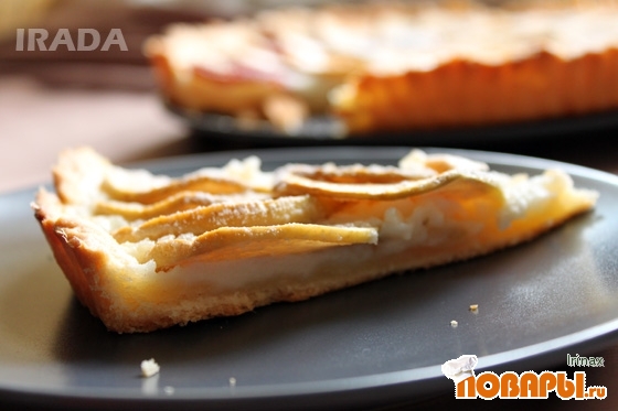 Яблоки нарезать дольками, выложить на тесто, залить кремом. Выпекать в духовке при 180 гр. около часа.
