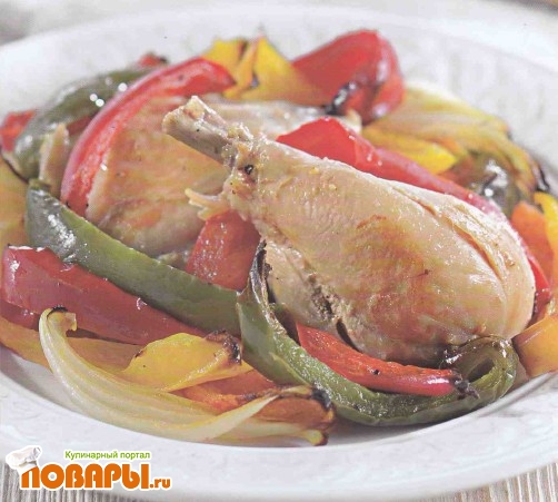Форму с оставшимся соусом верните в духовку на 10 мин. Затем выньте форму, переложите в соус запеченные овощи, перемешайте и сразу же выложите на блюдо к цыпленку. Подавайте немедленно.