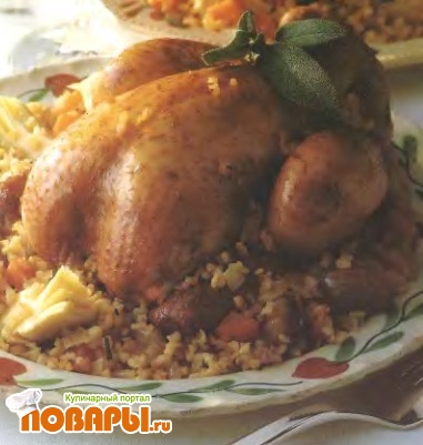 Из цыплят, запеченных с булгуром, получается ароматное сочное блюдо. Вместо булгура вы можете взять белый или коричневый длиннозерновой рис, а в остальном следовать рецепту. В этом необычном блюде булгур впитывает выделяющийся из цыплят и овощей сок, отдавая свой пикантный привкус.