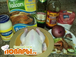 Разогреваем духовку до 180 градусов. Промываем цыплёнка или среднюю курицу, смотрим чтоб не осталось никаких перьев! Срезаем лишние куски кожи и несъедобные края крыльев. Отдельно готовим маринад - режем полукольцами лук, измельчаем чеснок. Добавляем туда оливковое масло, майонез, бальзамический уксус.