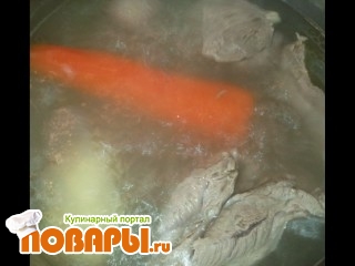 Промываем кусок баранины и ставим варить. После закипания снимаем пену, добавляем к мясу очищенную луковицу, морковь и картофелину.