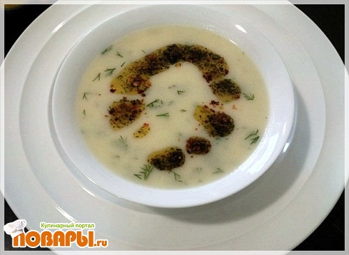 Эти действия нужны для того, чтобы от разных температур йогурт не разслоился. Иначе будет не кремовый суп, а вода отдельно и йогурт хлопьями. Добавляем нарезанный укроп и солим. Отдельно растопим сливочное масло, добавим в него красный перец и сухую мяту. Держим на огне около минуты, до образования пены и приятного запаха. Мясо режем на мелкие кусочки.