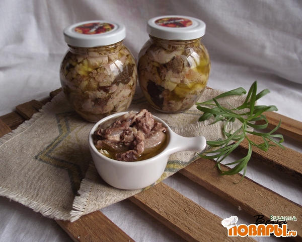 Ошпариваем баночки кипятком, раскладываем в них горячую тушенку, заливаем выделившимся при варке соком.
