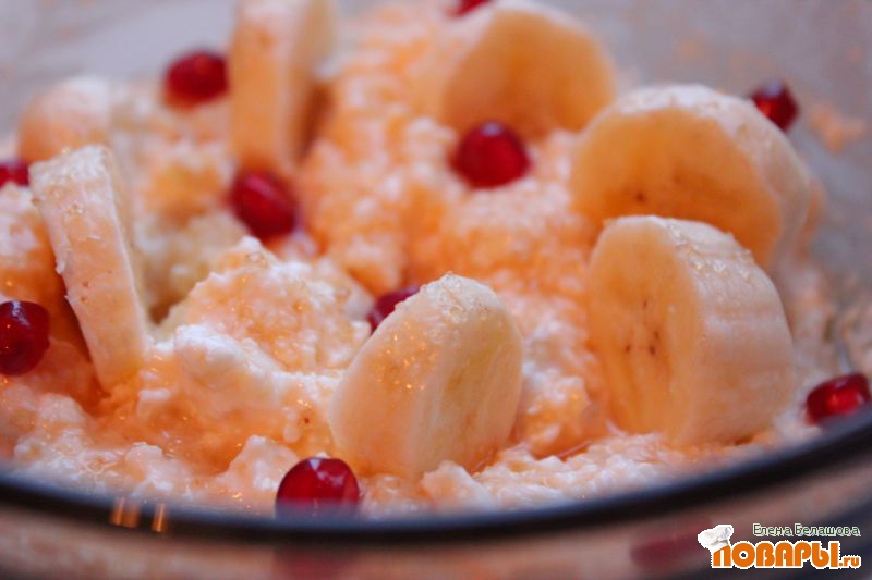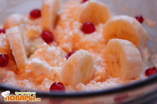 Нарезаем банан, добавляем к творогу и перемешиваем.