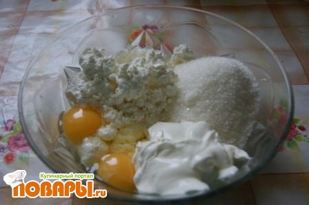 Творог размять так, чтобы получилась однородная мелкозернистая масса. Добавить в творог яйца, сахар и сметану. Все перемешать.