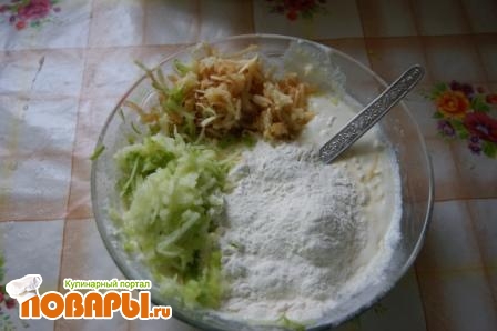 В получившуюся массу нужно на крупной терке натереть яблоки, добавить муку и снова все перемешать.